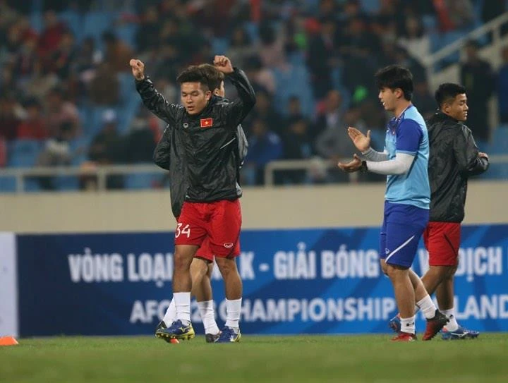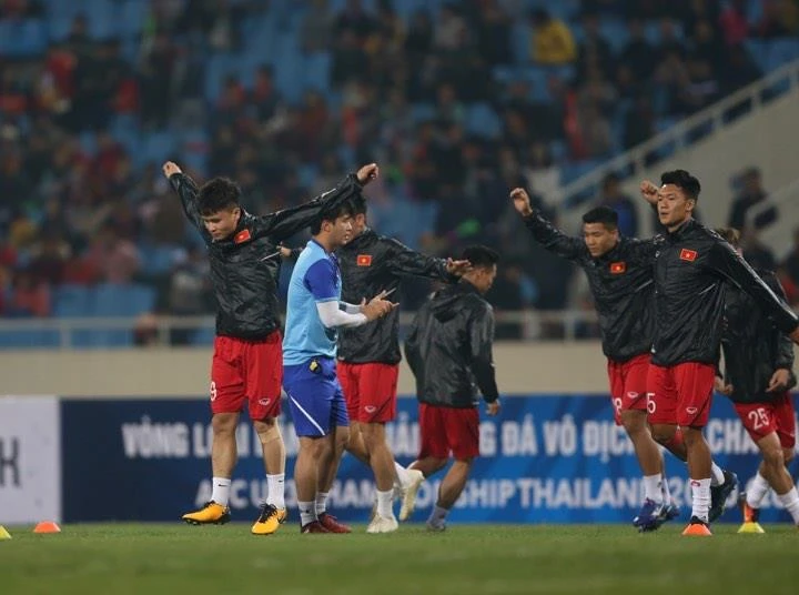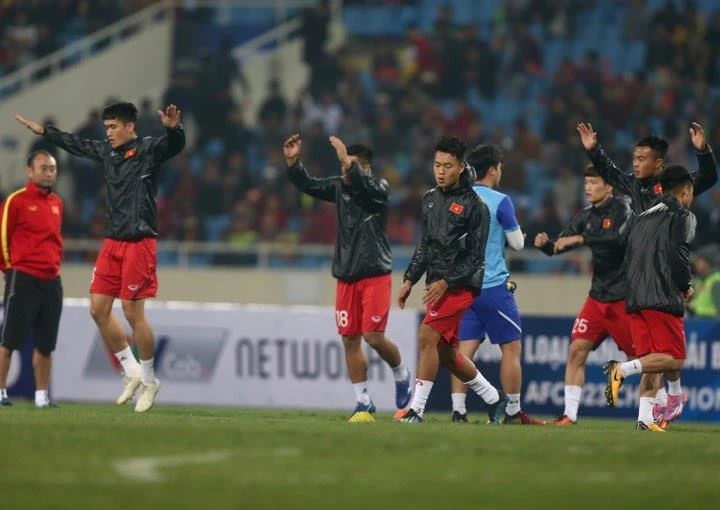 Các cầu thủ U-23 Việt Nam khởi động trước trận đấu.