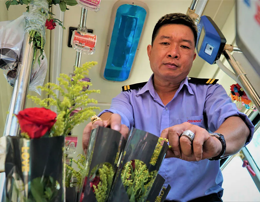 Anh Lê Xuân Huy chuẩn bị hoa và tặng cho hành khách nữ trên chuyến xe buýt của mình vào ngày 8-3. Ảnh: BẢO PHƯƠNG