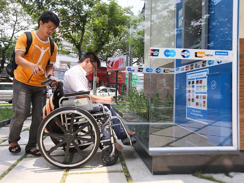 Anh Nguyễn Minh Hảo (ngồi xe lăn) trong một lần cùng nhân viên DRD đi khảo sát mức độ tiếp cận của người khuyết tật. Ảnh: TL