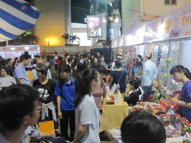 Đông đảo bạn trẻ tham quan các gian hàng bày bán các mặt hàng thủ công do chính tay những người khuyết tật làm trong ngày hội.