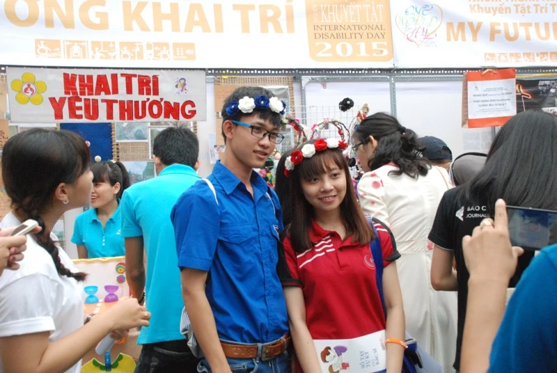 Các bạn trẻ mua quà ủng hộ và chụp ảnh lưu niệm trong ngày hội Quốc tế Người khuyết tật.