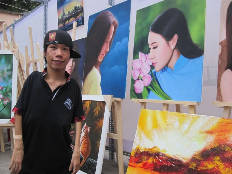 Gian hàng tranh sơn dầu được vẽ bằng miệng của chàng họa sĩ khuyết tật 9X tài năng Lê Minh Châu thu hút đông đảo khách tham quan và chụp ảnh trong ngày hội.