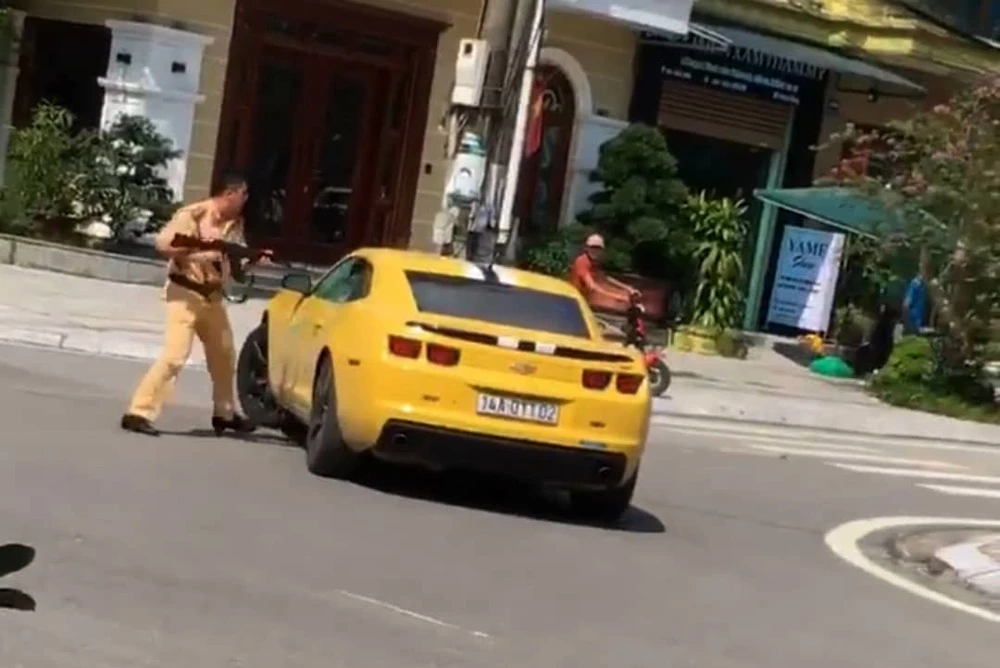 Vụ việc được xác định xảy ra tại TP Móng Cái (Quảng Ninh) sáng cùng ngày. Theo đó, một xe bán tải của CSGT nháy đèn, hú còi đuổi chặn được chiếc siêu xe thể thao màu vàng hiệu Chevrolet Camaro trên đường phố.