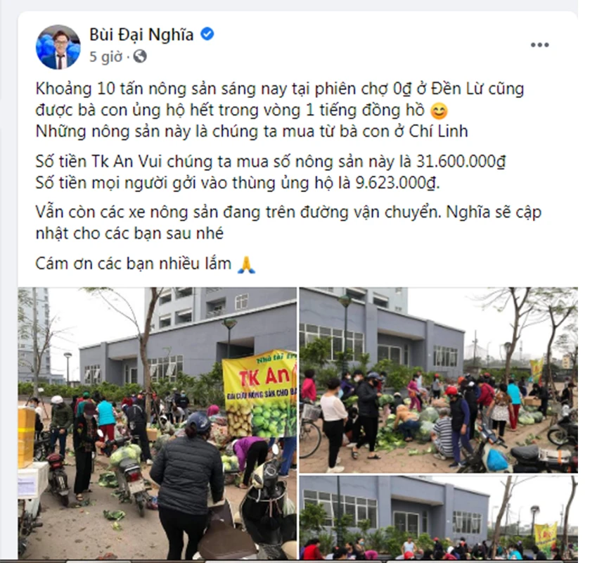 Nổi bật trong đó là nghệ sĩ Đại Nghĩa với hành động giải cứu 25 tấn rau củ thông qua hình thức Phiên chợ 0 đồng. Trên trang cá nhân, MC Đại Nghĩa công bố điểm chợ 0 đồng đầu tiên của tài khoản An Vui tại Hà Nội đã tiêu thụ hơn 12 tấn nông sản. MC Đại Nghĩa chia sẻ trên Facebook: “Tổng cộng 12 tấn nông sản tại điểm này chỉ trong một chốc đã hết sạch sẽ. Bà con đến lấy rất đông, có những người còn lấy về để mang đi... bán lại nữa. Nghĩa nghĩ rằng mục tiêu của chúng ta là mua giúp bà con Hải Dương nông sản và tìm đầu tiêu thụ thì giờ bà con đến lấy nhiều hơn bình thường một chút càng tốt, hay có lấy về mang đi bán lại cũng không sao. Vì nếu có lấy nhiều hơn thì có khi cũng lấy giùm cho bà con hàng xóm, chứ nông sản cũng đâu thể lấy về mà tích trữ lâu được. Còn nếu có đi bán thì cứ coi như mình đang giúp một số người có thêm thu nhập, vậy cũng tốt mà”.