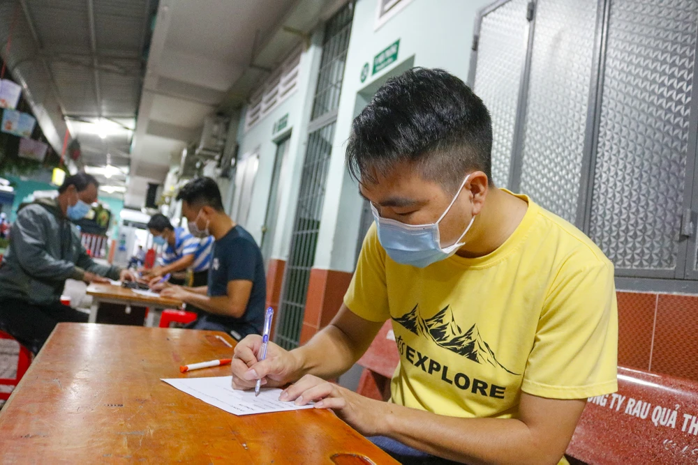 Sau khi chứng minh được các giấy tờ xác nhận là người lao động trên địa bàn quận Gò Vấp, lực lượng chức năng phát giấy để họ khai thông tin.