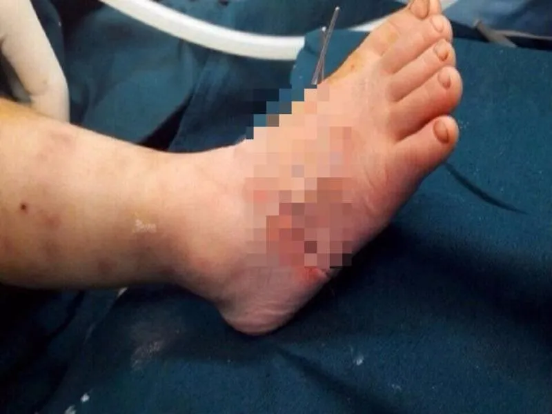 Tại đây, các bác sĩ (BS) khoa Chỉnh hình nhi tiếp nhận bé Đ. trong tình trạng sốc chấn thương, bàn chân phải gần đứt lìa, mất nhiều máu, đứt xương, đứt động mạch, đứt dây thần kinh gân cơ. Ngay lập tức các BS đã tiến hành hội chẩn và quyết định phẫu thuật nối bàn chân phải cho bé Đ. trong sáng cùng ngày.