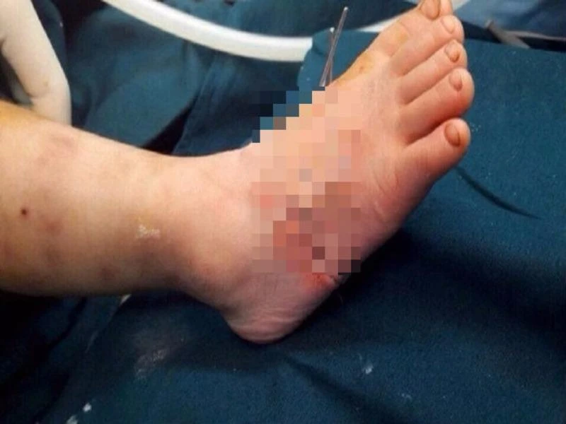 Theo gia đình bệnh nhi, ngày 24-10, trong lúc gia đình không để ý, bé Đ. đã trèo lên máy làm miến của gia đình để nghịch, không may bị máy cứa gần đứt lìa bàn chân phải. Sau khi nghe bé la khóc, gia đình phát hiện và đưa Đ. đến BV Quân y 103 sơ cứu sau đó chuyển đến BV Nhi Trung ương.