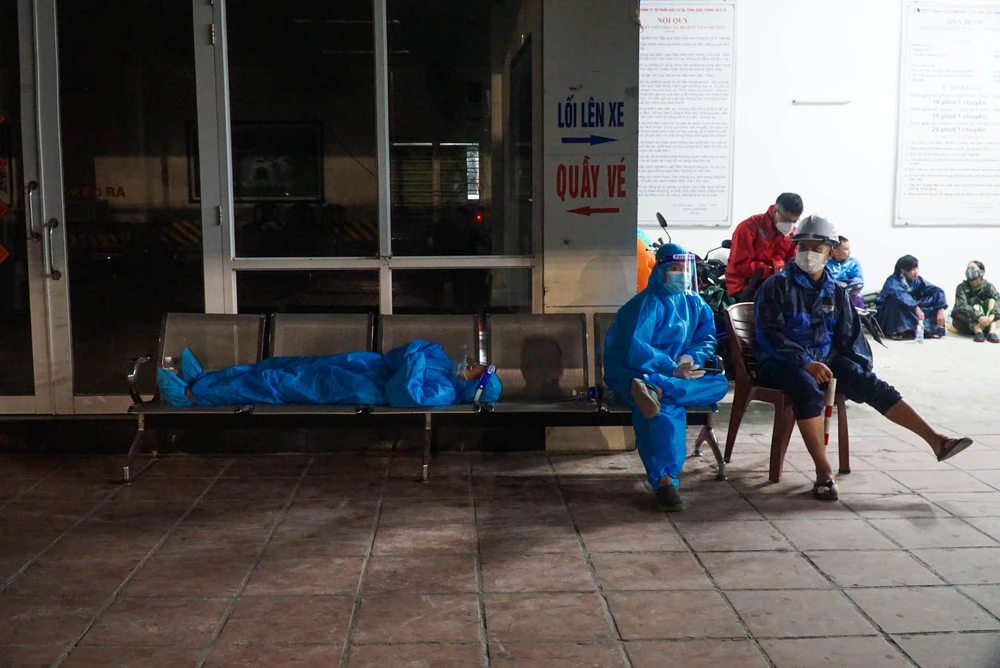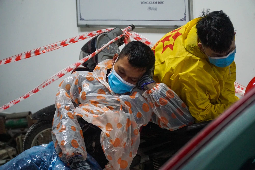 Tổ cấp cứu lưu động tại trạm trung chuyển hầm Hải Vân tranh thủ thay phiên chợp mắt sau khi hỗ trợ một số bà con sơ cứu, chữa trị vết thương trong hành trình dài hồi hương. Ảnh: BT.