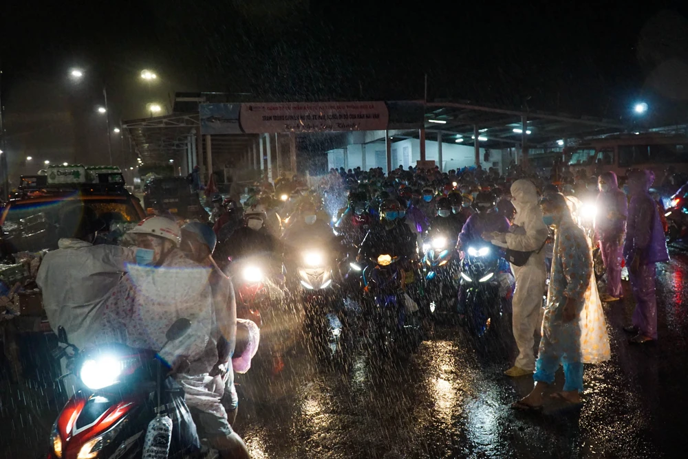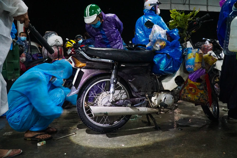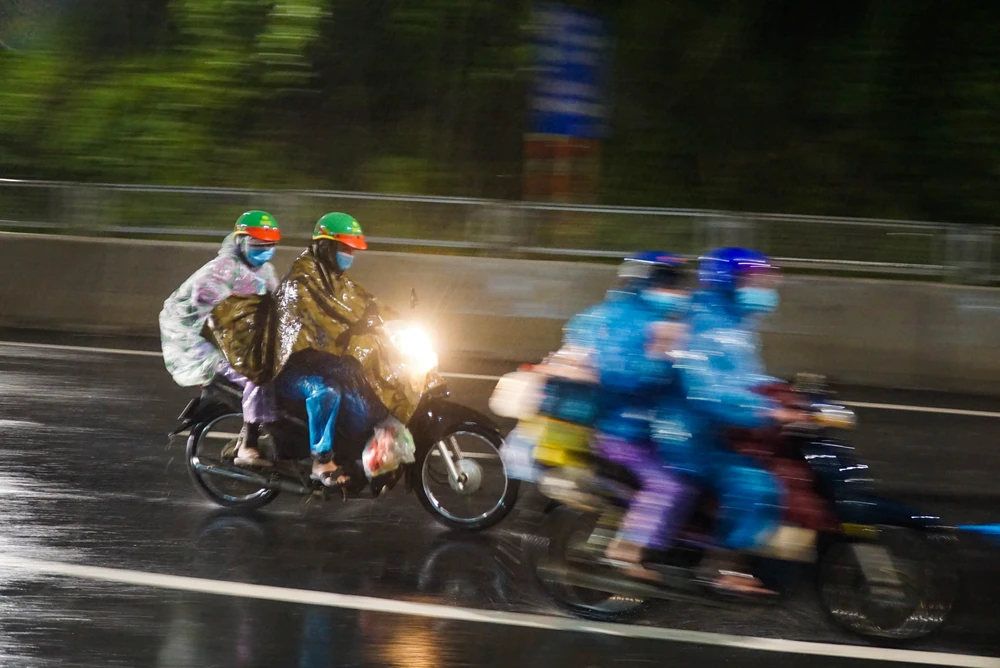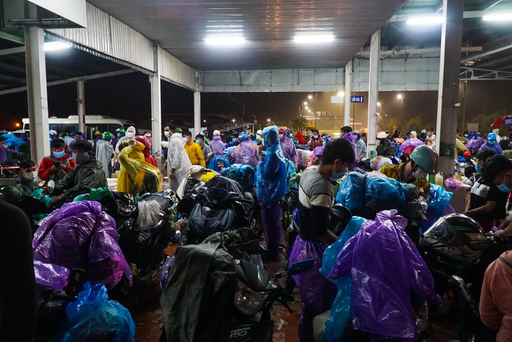 2 giờ sáng ngày 8-10, mưa ngày càng xối xả do ảnh hưởng của bão số 7. Giữa mưa gió tầm tã, dòng người đi xe máy từ các tỉnh Bình Dương, Đồng Nai, TP.HCM...vẫn đổ về trạm trung chuyển hầm Hải Vân (TP Đà Nẵng) mỗi lúc một đông.