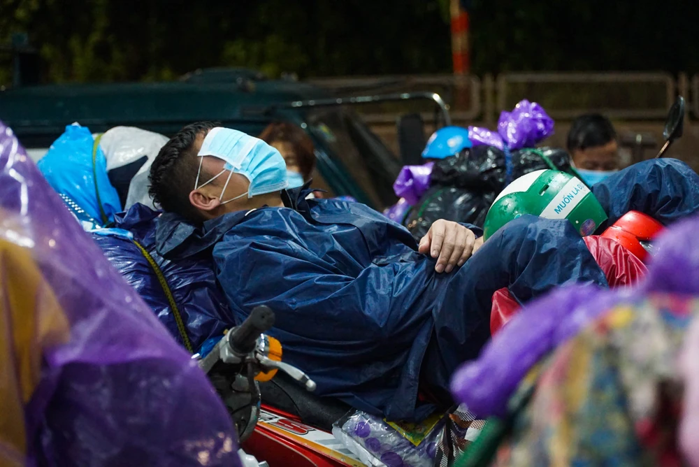 Một số người nằm ngủ luôn trên xe máy. Ảnh: BT.