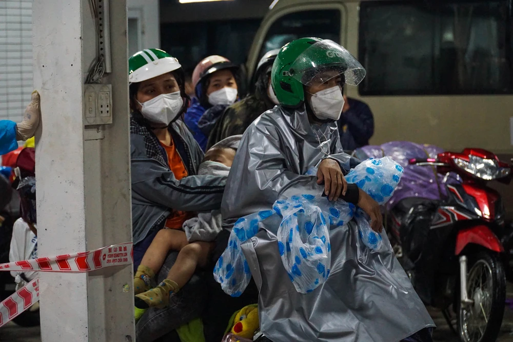 Nhiều em nhỏ cùng cha mẹ chạy xe trong đêm mưa ướt sũng, mệt, đói nên ngủ luôn trên tay người lớn.
