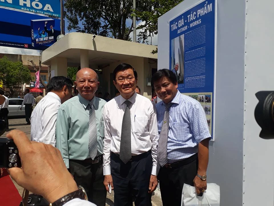 Nguyên Chủ tịch nướcTrương Tấn Sang và tác giả Giản Thanh Sơn bắt tay chúc mừng cuộc triển lãm. Ảnh: HUỲNH LÃNH