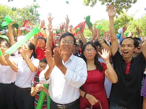 Ông Hồ Đắc Mạnh (ba) và mẹ của Thanh Chương cùng bạn bè Trường chuyên Quốc học Huế trong niềm vui chiến thắng. Ảnh: V.DƯƠNG