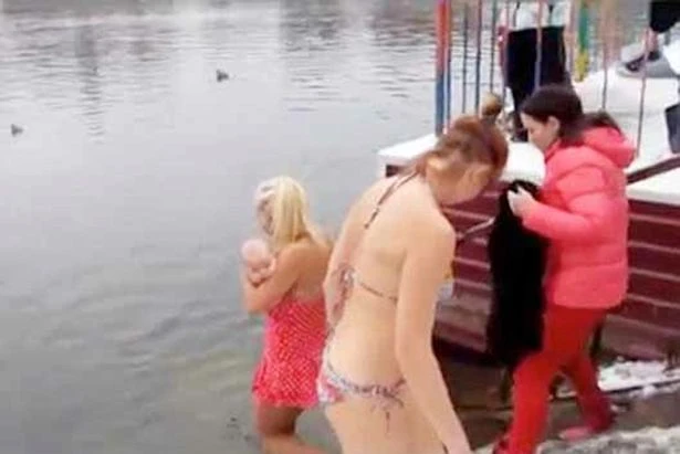 Bà mẹ mang con xuống hồ nước buốt giá. Ảnh: The Mirror