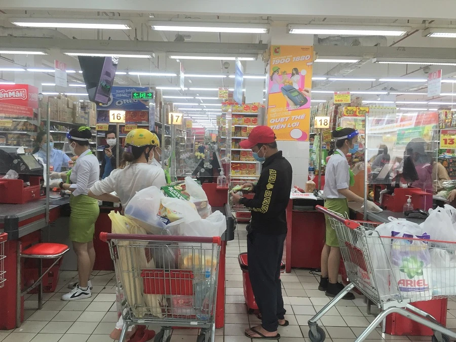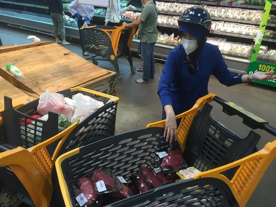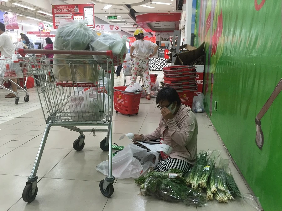 Bà Thủy (quận 3) cho biết: Hôm qua bà đi khỏi nhà từ 6 giờ sáng tới 12 giờ trưa mới được tính tiền, nay siêu thị vắng hơn nhiều. Hôm nay bà đi mua dùm cho năm gia đình hàng xóm, chỉ mua một số mặt hàng như hành lá, xà lách, nước ngọt…mà hết hơn 900.000 đồng.