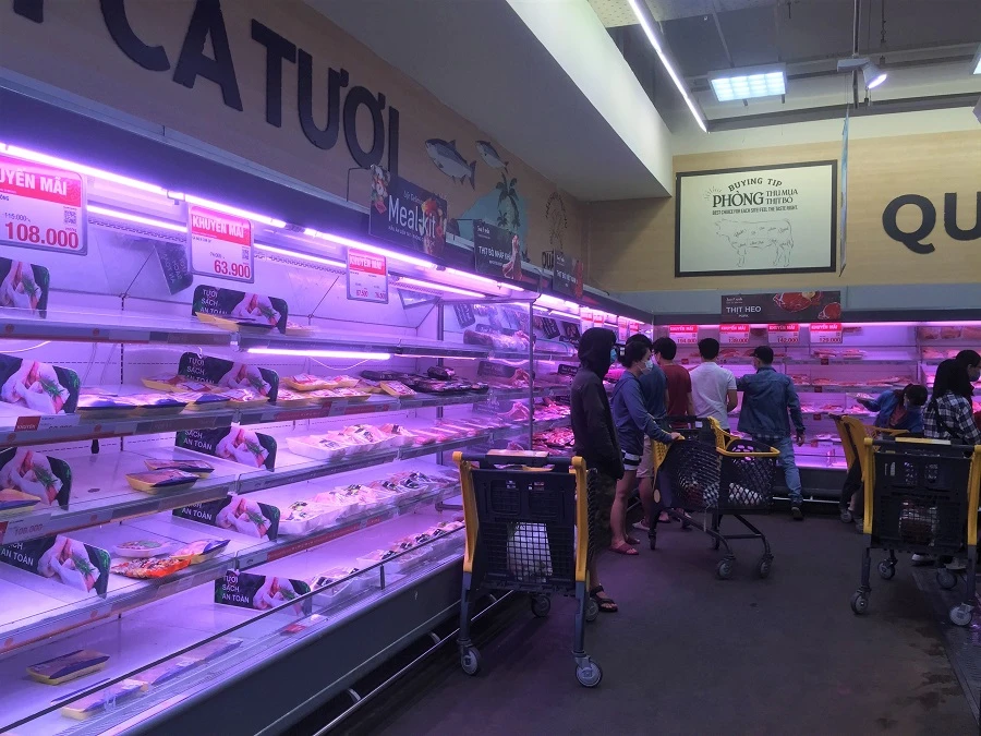 Theo đó, tại siêu thị Big C miền Đông quận 10 người dân chỉ cần khai báo y tế và được phép vào bên trong mua sắm. Ghi nhận cho thấy khu vực hàng thực phẩm tươi sống rau củ quả, thịt, thủy hải sản có nhiều người dân chọn mua, các khu vực hàng phi thực phẩm vắng khách hơn.