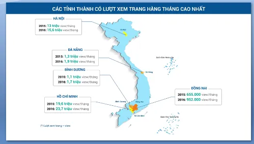 Theo đó, riêng trong 2015, lượng tìm kiếm thông tin bất động sản tại Hà Nội và TP HCM luôn dẫn đầu với 32,6 triệu lượt xem, chiếm tới gần 80% tổng lượng xem trang của cả nước. Đà Nẵng, Bình Dương, Hải Phòng là những điểm nóng tiếp theo về lượng tìm kiếm bất động sản.