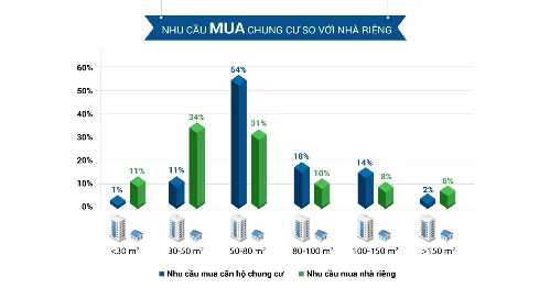 Đối với từng loại diện tích, tỷ lệ người chọn mua chung cư hoặc nhà riêng có sự khác biệt. Với các loại diện tích 30m2, 30-50m2, 150-200m2, số người chọn mua nhà riêng cao hơn hẳn so với người chọn mua chung cư. Trong khi đó, ở các loại diện tích 50-80m2, 80-100m2, 100-150m2, nhu cầu mua chung cư cao hơn so với nhà riêng.