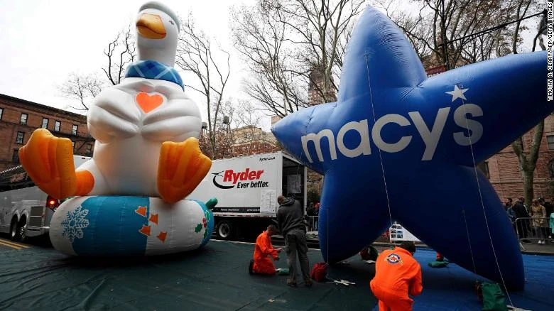 Những quả bóng bay khổng lồ trong cuộc diễu hành lễ Tạ ơn có thể không bay lên vì gió lớn. Ảnh: CNN