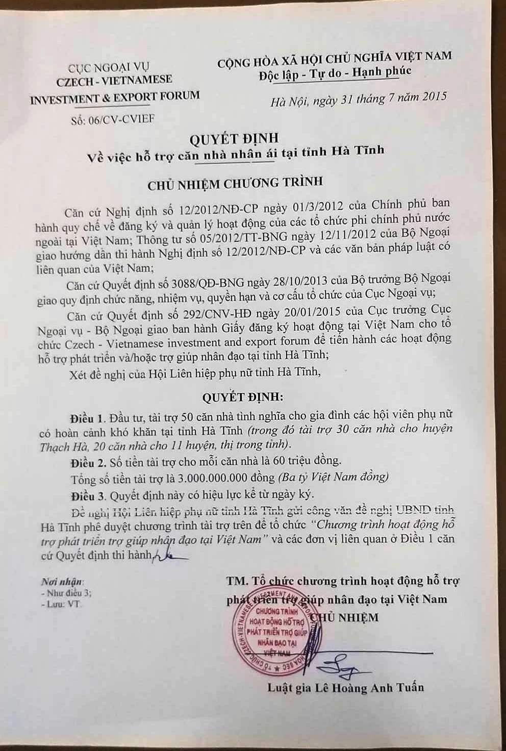 Theo Hội Liên hiệp phụ nữ tỉnh Hà Tĩnh, đầu năm 2015, ông Lê Hoàng Anh Tuấn (quê Nghệ An) về Hà Tĩnh trình ra giấy đăng ký hoạt động tại Việt Nam do cục trưởng Cục Ngoại vụ (Bộ Ngoại giao) ký, chấp thuận cho Tổ chức Czech - Vietnamese investment and export forum (trụ sở chính tại Cộng hòa Séc) với mục đích và lĩnh vực hoạt động là Bảo trợ xã hội.