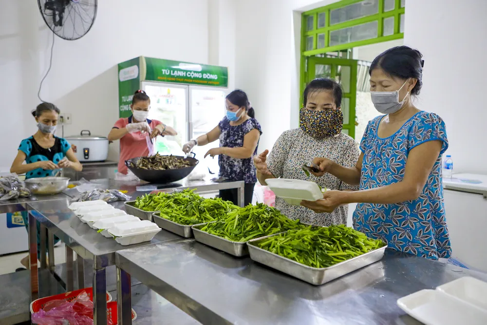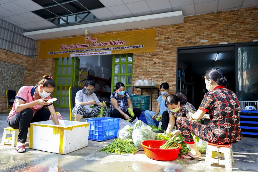 Hơn nửa tháng nay, mỗi ngày từ 7 giờ sáng nhóm "Bếp yêu thương" ở TP Thủ Đức, TP.HCM với hơn chục tình nguyện viên chia nhau công việc, người thì lặt rau, người chiên cá, người nấu cơm để chuẩn bị nhiều suất ăn miễn phí cho người nghèo.