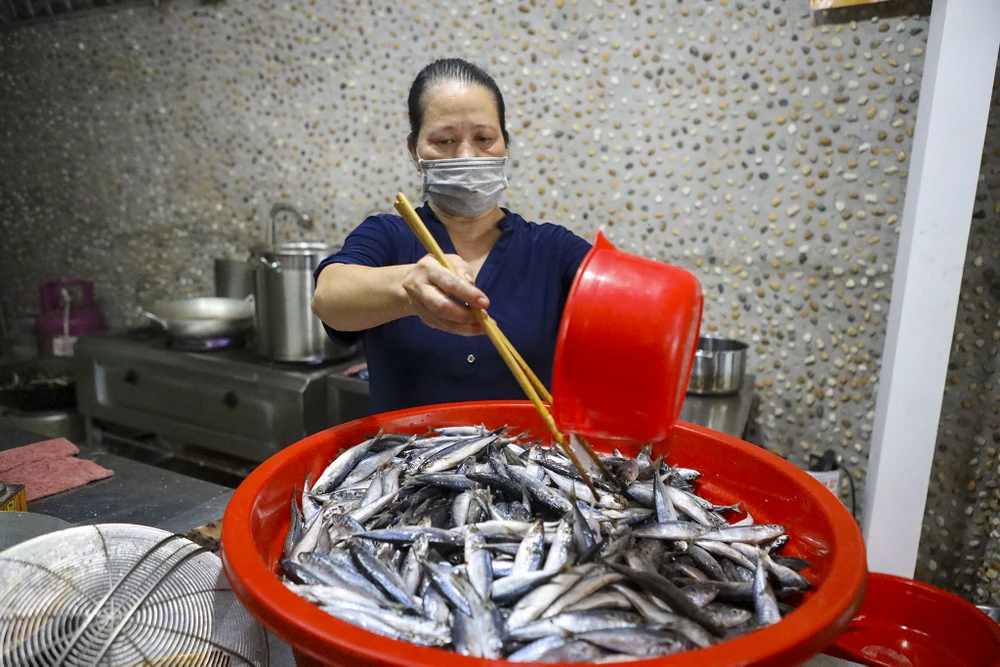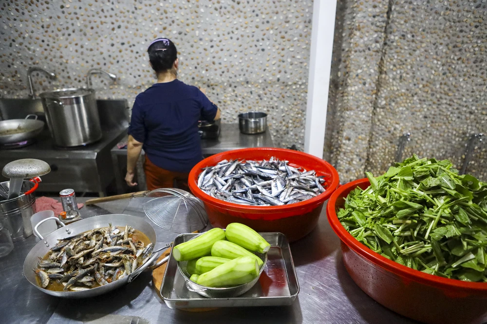 Hằng ngày, bếp chế biến khoảng 100 ký cá nục, chủ yếu là 2 món cá chiên và cá kho cà.