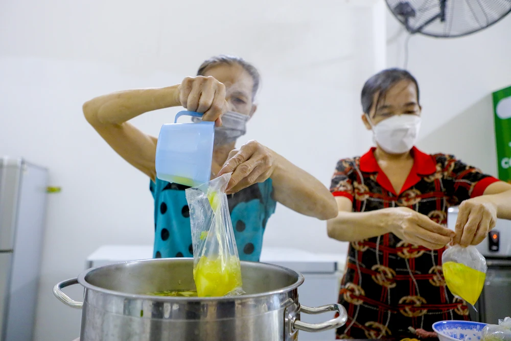 Bà Ánh (tình nguyện viên) múc những bịch canh cho vào túi, bà cho biết, hồi tháng 5 bà có từng nhận cơm miễn phí của bếp ăn này, thấy việc ý nghĩa nên bà đã xin theo để phụ giúp trong những ngày tạm nghỉ việc do dịch.