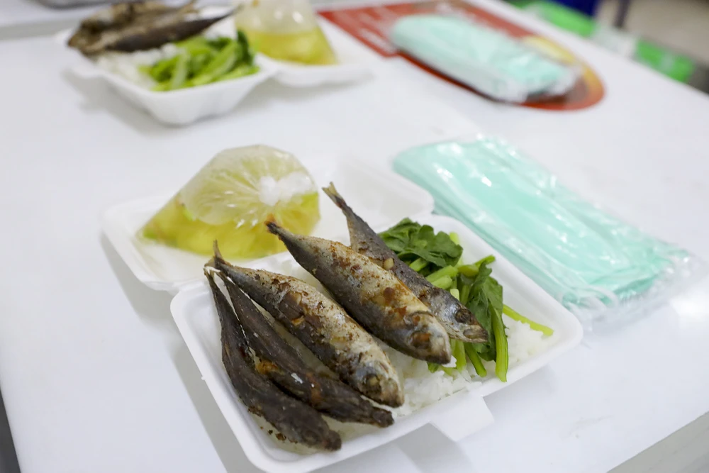 Mỗi hộp cơm sẽ có cá, rau, canh kèm theo một bịch khẩu trang.