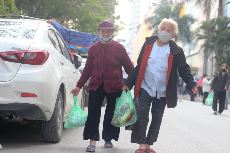 Cùng với người bạn già của mình, bà Nguyễn Thị Hảo (quê ở Lào Cai) bước những bước chân nặng nề với món đồ vừa được nhận. Bà giới thiệu người phụ nữ bên cạnh cũng là “đồng nghiệp” của mình, một người đi nhặt đồng nát ở Hà Nội. "Chúng tôi đi nhặt rác kiếm ăn hàng ngày, nhưng dịch thì cũng không được mấy. Không có cái này, chúng tôi đói mất” - bà nói.