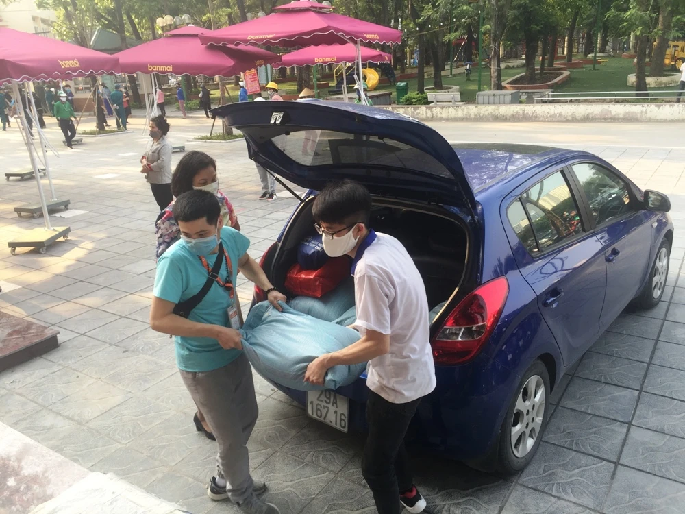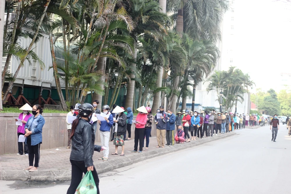 Tuy nhiên, đến sáng 15-4, cảnh tượng đó đã được thay thế bằng dòng người xếp hàng dài ra từ sân vận động đến sân Nhà văn hóa phường Nghĩa Tân...