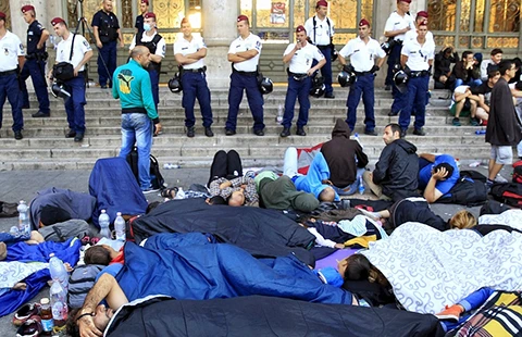 Hôm trước cảnh sát đã giải tán người nhập cư sau khi họ tràn lên chuyến tàu cuối đi Vienna (Áo). Buổi tối, hàng ngàn người ngủ vạ vật trước ga (ảnh). Đến sáng, cảnh sát tiếp tục ngăn 2.000 người nhập cư lên tàu đi Áo và Đức. Họ tuyên bố sẽ biểu tình đến chừng nào có tàu đi thì thôi.
