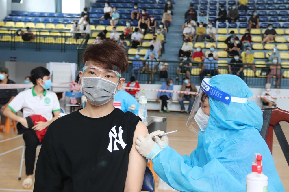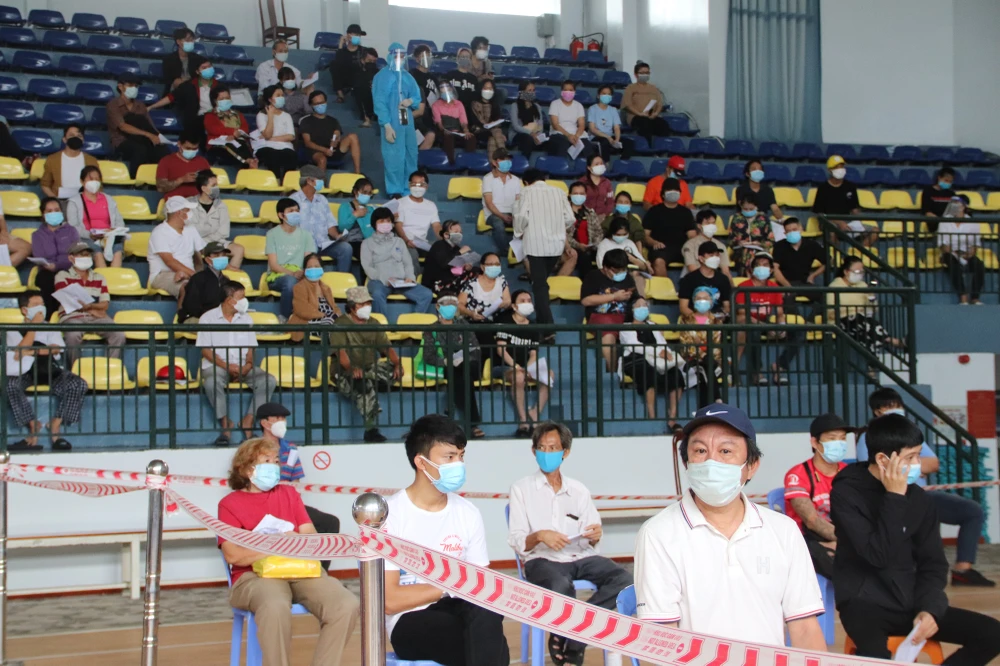 Nhiều người dân đến để được tiêm vaccine mũi 1 và 2 ở nhà thi đấu Hồ Xuân Hương, quận 3.