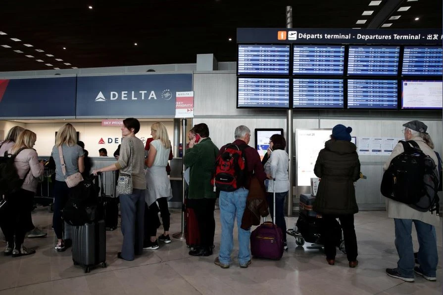 Người dân xếp hàng trước quầy vé hãng Delta Air Lines ở sân bay Charles de Gaulle tại Paris (Pháp) mua vé bay về Mỹ, ngày 12-3. Ảnh: REUTERS