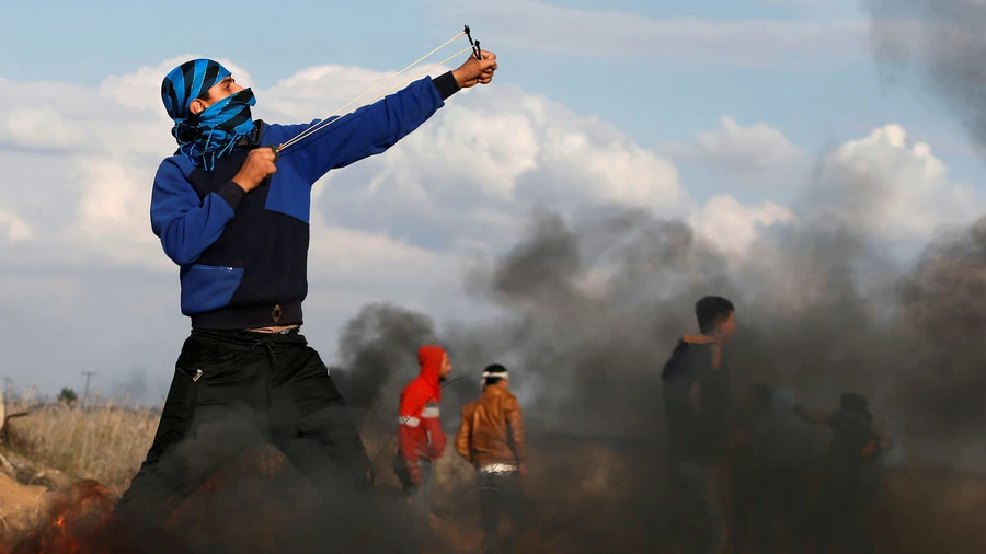 Một người Palestine dùng ná cao su bắn đá vào một vật thể trông như máy bay không người lái của Israel. Ảnh: RT