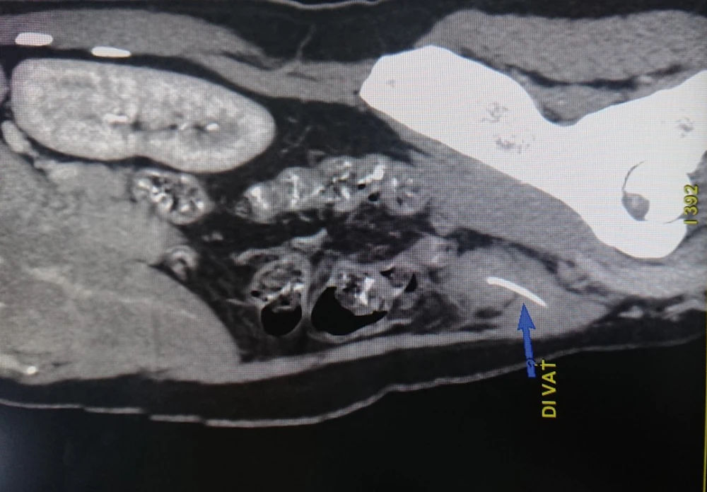 Kết quả chụp CT bụng có cản quang cho thấy có dị vật dạng xương cá đâm xuyên thành quai ruột non vùng hố chậu trái. Các bác sĩ đã phẫu thuật nội soi cấp cứu cho bệnh nhân, bóc tách khối viêm ở thành bụng thì thấy hố chậu trái có khối viêm kích thước 3x4 cm được mạc nối lớn bám.