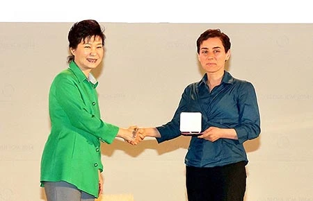 Tổng thống Hàn Quốc Park Geun-hye mừng nữ GS Maryam Mirzakhani tại Seoul ngày 13-8. Ảnh: GETTY IMAGES