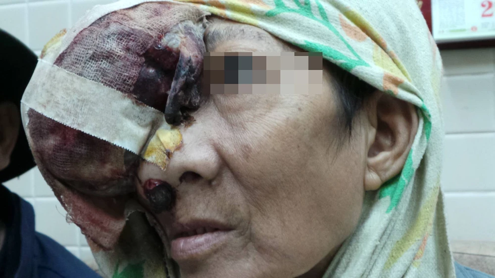 | Tuy nhiên, cũng trong chiều cùng ngày, BS Dũng, cho biết với những diễn tiến tiếp theo của bệnh tương đối phức tạp nên các bác sĩ đã nhanh chóng cho chị Đông nhập cấp cứu trở lại để điều trị. Bệnh nhân nhập viện trong tình trạng đau nhức, khối u vùng mắt to gấp 3-4 lần so với u ban đầu chưa phẫu thuật, chảy máu, hôi thối và được băng lại.Theo BS Dũng, việc bệnh nhân không tuân thủ chỉ định hóa trị, xạ trị đã tạo điều kiện cho tế bài ung thư ác tính phát triển nhanh, dẫn đến tình trạng phì đại mô thịt qua hốc mắt. |