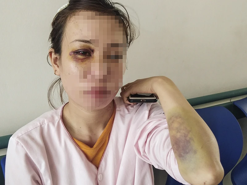 Trước đó, chị N. nhập viện trong tình trạng hốc mắt phải bị rách, chảy nhiều máu, mắt phù nề và thâm tím. Vùng cổ, tay nhiều chỗ bị thương.