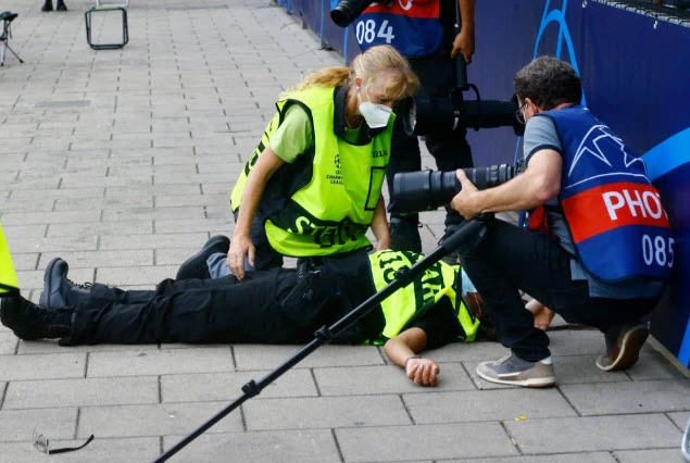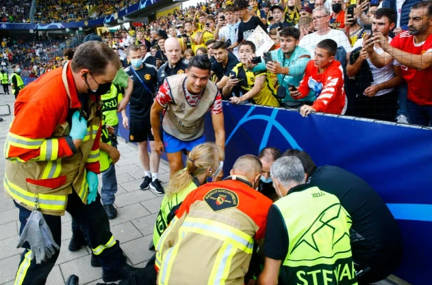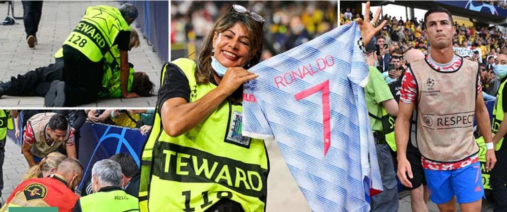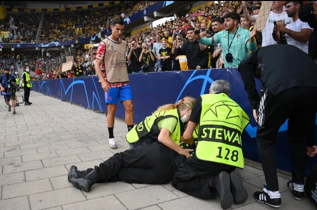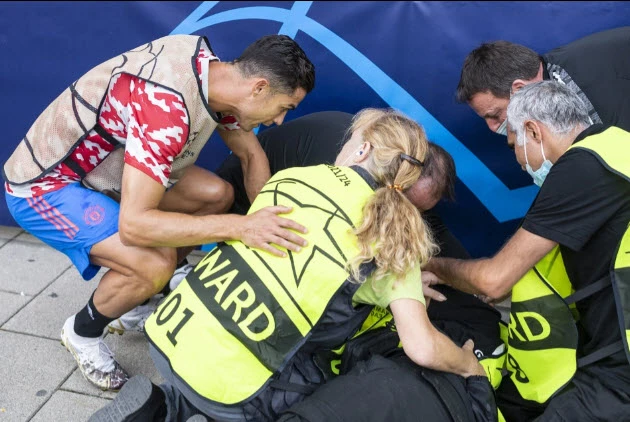Ronaldo cũng nhảy qua hàng rào ngăn cách nhanh chóng xem xét tình hình của người phụ nữ. Cô có vẻ hơi đau và bị choáng nhưng sau đó đã hồi phục. Sau khi biết nhân viên này vẫn ổn, Ronaldo quay trở lại sân tiếp tục khởi động.