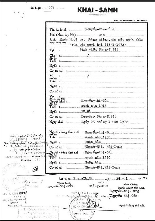 Giấy khai sinh này và đứa trẻ sơ sinh sau đó đã được giao cho trại trẻ mồ côi Lạc Đạo (Phan Thiết) vào ngày 17-1-1972 do một người phụ nữ đến ủy thác trong vòng tay của một nữ tu.
