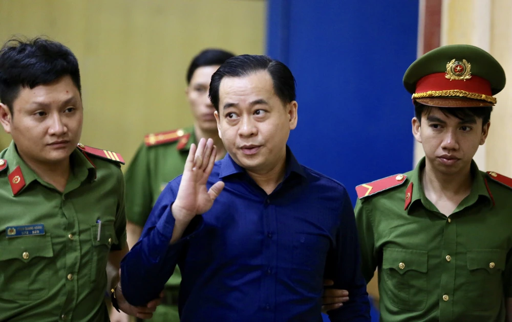 Vũ "nhôm" kịp giơ tay chào người thân trước khi bước vào phòng xử sáng nay (10-12). Ảnh: HUỲNH TRƯỜNG GIANG
