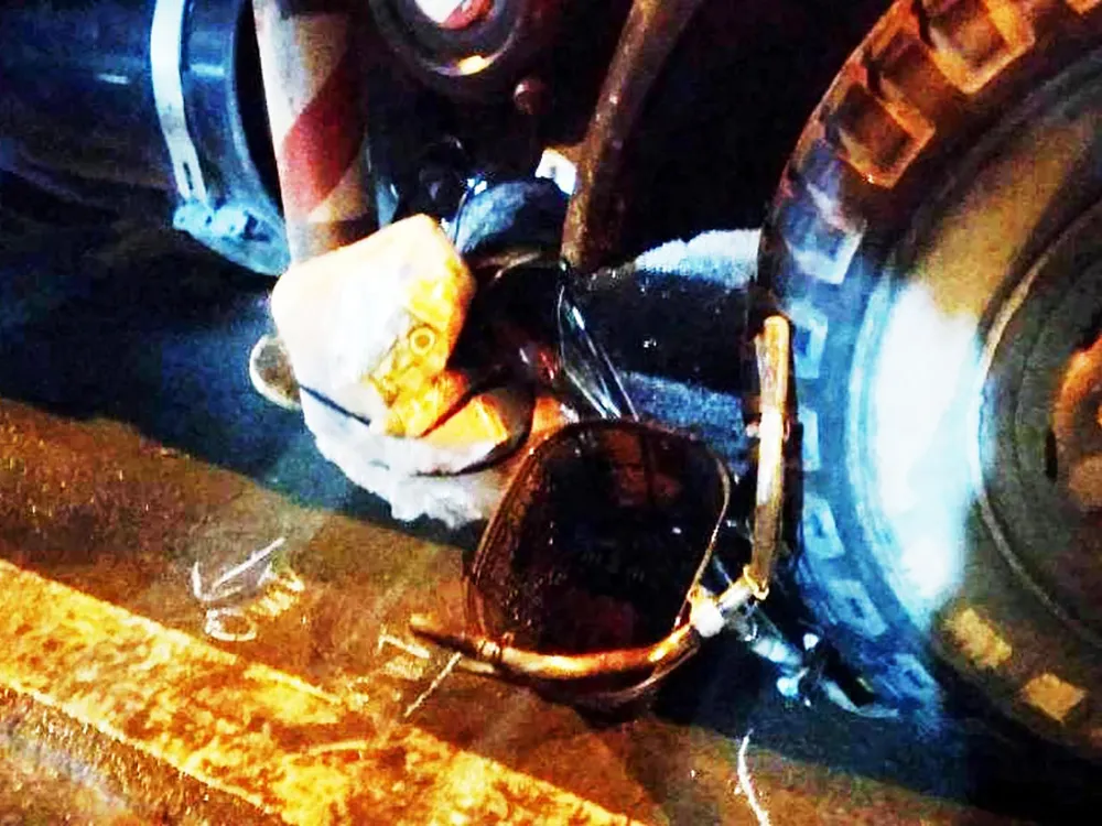 Chiếc xe máy mắc kẹt dưới bánh xe bơm hút bê tông, hư hỏng.