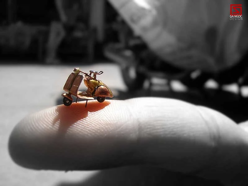 Một con chuồn chuồn ớt cánh mỏng giương đôi mắt lồi long lanh; một chiếc mô tô hùng dũng ngửa mặt lên trời, pô xe hai nòng, bình xăng gắn mác Harley-Davidson cực oách, như chỉ còn chờ một cú đề pa là rú ga lao bắn đi; một người đàn ông bán nude đứng khoanh tay, ngực vuông lộ từng múi cơ cuồn cuộn, đẹp mê hồn như tượng David… Tất cả chính xác đến từng tiểu tiết như thật, bình thản hiện diện trên… một ngón tay. Người sở hữu đôi tay tài hoa tạo tác nên thế giới tí hon hút hồn là Trần Giang Nam, 38 tuổi, dân TP.HCM chính gốc.