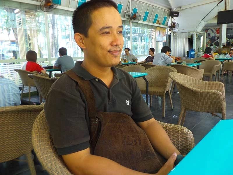 Thoạt nhìn đã nhận ra ngay chất nghệ sĩ trong phong cách bụi phủi của Trần Giang Nam qua mái đầu đinh, chiếc Vespa cổ nhả khói bành bạch, túi da màu nho úa to sụ đeo chéo vai, thêm quần jeans, áo pull màu tối cùng đôi giày bò.