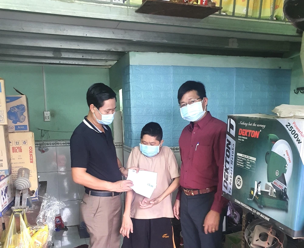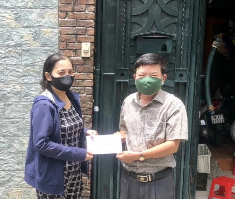 Đại diện Ban Cứu trợ HĐH tỉnh Quảng Bình tại TP.HCM trao tiền cho bà con đồng hương gặp khó khăn do dịch bệnh. Ảnh: HĐH