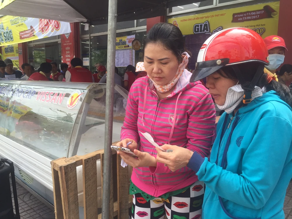 Anh Nguyễn Văn Dũng, nhà ở Gò Vấp đang cầm trên tay tờ rơi bảng giá cho biết đến cửa hàng đứng chờ cả tiếng đồng hồ chứ đi lúc sáng sớm, sợ đông quá không chen chân nổi. Cuối cùng anh mua thịt đùi khúc với số lượng nhiều, giá chỉ có 41.000 đồng.