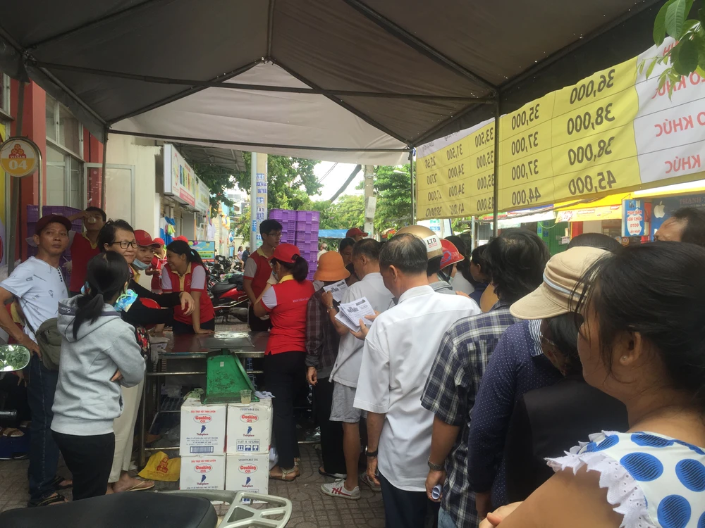 8h sáng ngày 13-6, ngay từ cổng cửa hàng Vissan 290 Nơ Trang Long (quận Bình Thạnh, TPHCM) ở khu vực bán thịt heo có rất đông người dân đứng chờ. Bà con tự xếp hàng ngay ngắn, trò chuyện cùng nhân viên bán hàng trong khi chờ nguồn heo mới từ nhà máy chở đến.