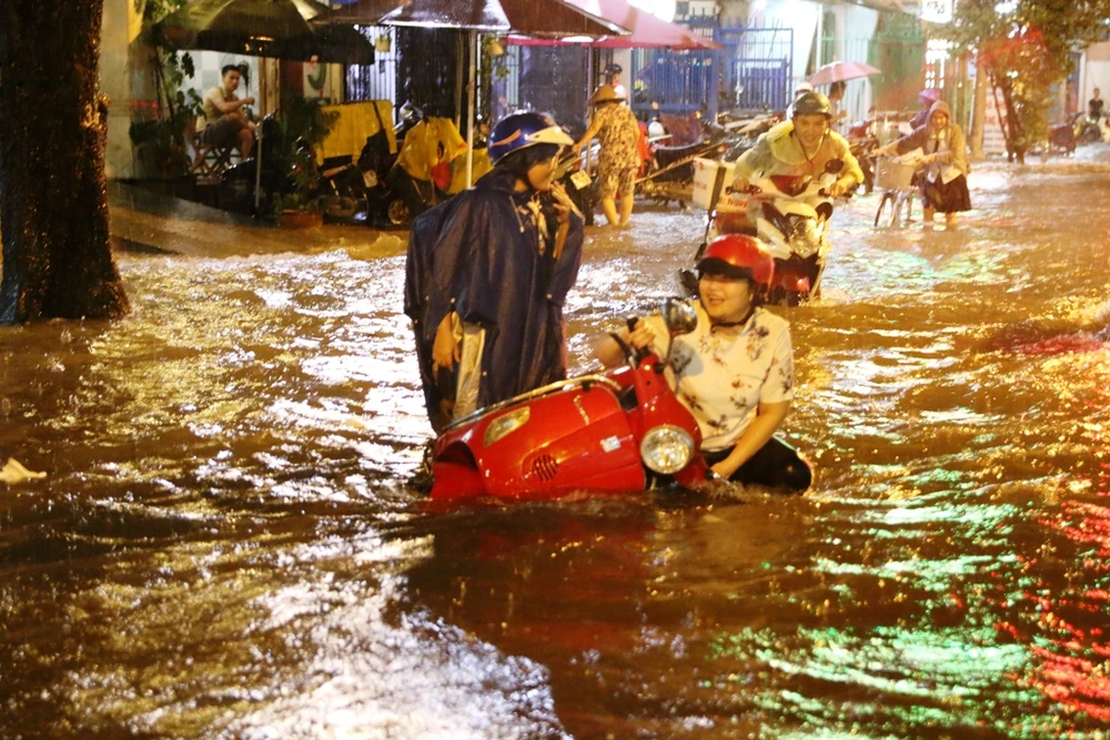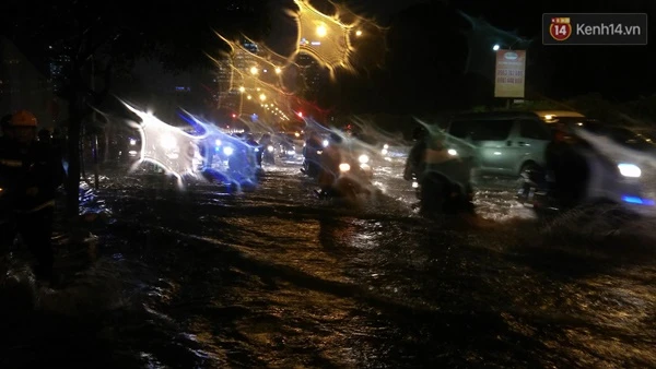 Đường Trần Nhân Tôn, quận 10 mưa rất to gây ngập nặng khiến giao thông qua lại khó khăn. Ảnh: kenh14