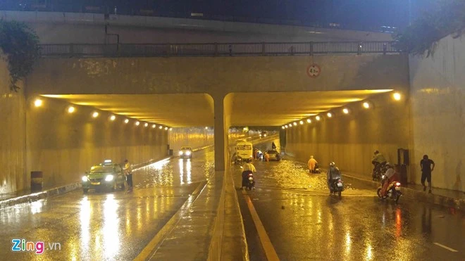 Hầm qua đường Nguyễn Hữu Cảnh (quận Bình Thạnh) bị ngập, hai xe ô tô chết máy trong hầm. Ảnh: zing