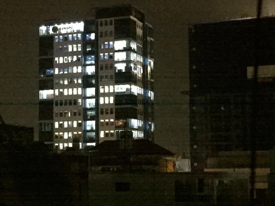 Sau cơn mưa, đường ngập, kẹt xe nên dân văn phòng nán lại, chưa về nhà. Ảnh: tòa nhà văn phòng của Tổng Công ty Điện lực Miền Nam trên đường Âu Cơ, quận Tân Phú, đối diện UBND phường 14, quận Tân Bình.